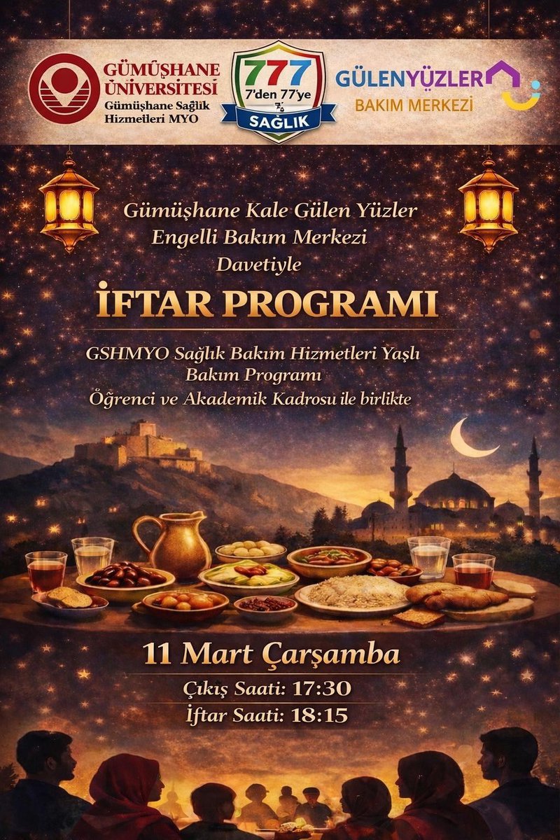 Gümüşhane Kale Gülen Yüzler Engelli Bakım Merkezi’nin davetiyle, Gümüşhane Üniversitesi Sağlık Hizmetleri Meslek Yüksekokulu Sağlık Bakım Hizmetleri Bölümü Yaşlı Bakım Programı öğrenci ve akademik kadrosunun katılımıyla iftar programı gerçekleştirilecektir.